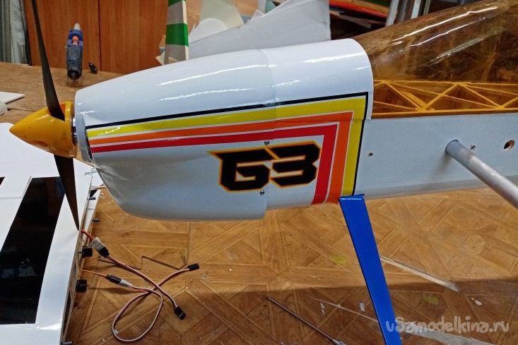 Пилотажная модель подверглась полному перекрасу. Основную ливрею исполнил простыми кисточками и акриловыми красками. Фирменную надпись отклеил и скопировал. Затем перерисовал с помощью скотча.