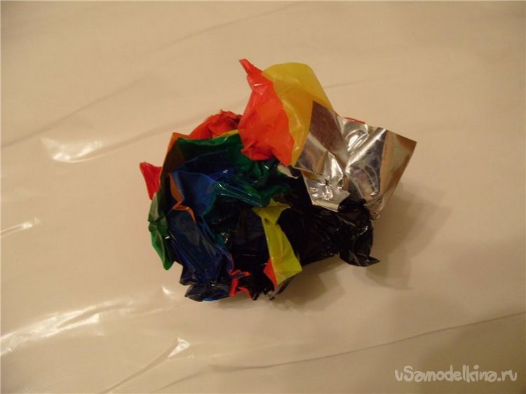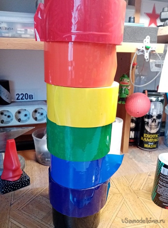 Начну с самого простого применения скотча. Оклейка пенопластовой детали разноцветными полосками.