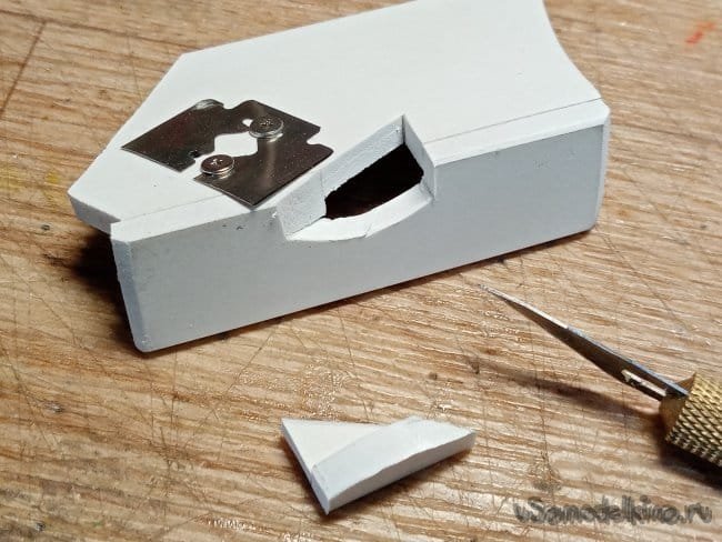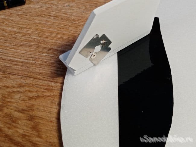 Для резки линий изготовил такой резак. Главное установить кончик лезвия на минимальную глубину. Чтобы он прорезал только скотч, но теоретически. Можно резать прямо на самолетике минимально повреждая пенопласт.