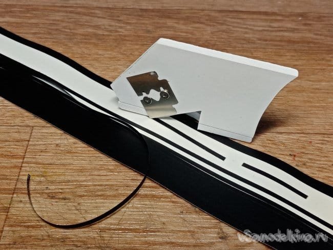 Приклеиваю полоску скотча на подложку. Размечаю и отрезаю край по шаблону. Или другим способом, как понравится. Аккуратно отделяю полоску от пленки и переношу в нужное место. Опять же приклеиваю кончик на место и поднимаю другой конец под небольшим углом. Прижимаю к поверхности слежу опять же чтобы не образовалось пузырей под пленкой. Если такая неприятность случилась. Прокалываю его кончиком ножа, выдавливаю воздух. Привожу образцы полосок с закругленными кончиками.
