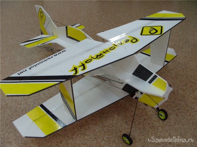 Рекламный бипланчик для полетов на лужайке. Все надписи выполнены скотчем.