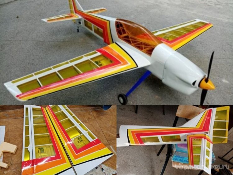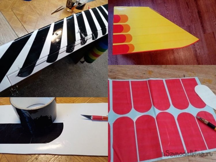 По такой же технологии можно раскрасит и пилотажную модель построенную по классической технологии. Из фанеры бальзы и пленки. В этом случае долго думал, как украсить самолетик, который предварительно оклеил термоусадочной белой пленкой для моделей. Можно было и оклеить такой же пленкой разных цветов. Но не разу не работал этой пленкой по пленке. Решил использовать мой любимый цветной скотч технология простая. Наклеиваю на подложку нужный цвет. По линейке отрезаю нужный размер полоску и наклеиваю. Вот что получилось из смешения классической технологии и скотча.
