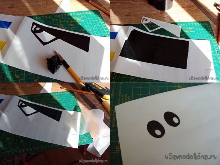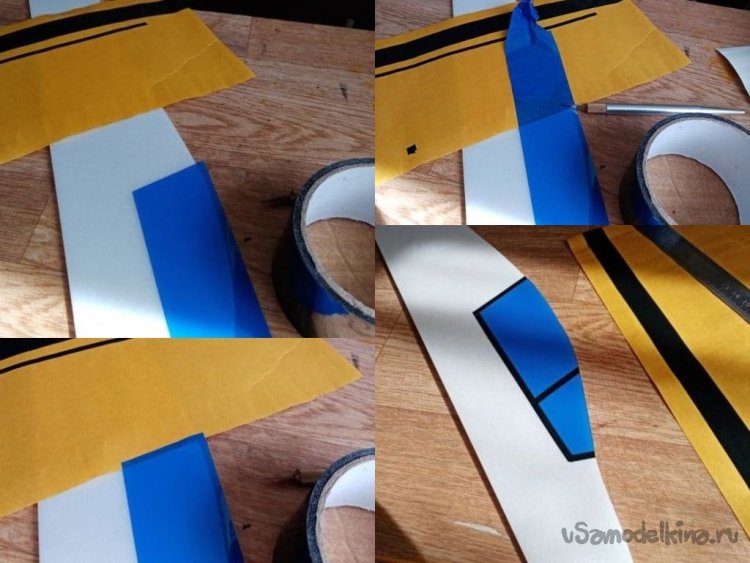 Поверх приклеиваю голубую полоску скотча. Отрезаю нужный размер. Затем внешний контур. Окантовку черными полосками произвожу по следующему сценарию. Приклеиваю скотч на вощеную бумагу, по металлической линейке нарезаю полосок разной ширины. Отделяю от нее и приклеиваю по контуру «остекления».