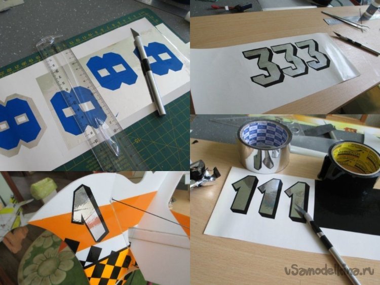 Продолжаю усложнять. Изготовление циферок с подложкой в два цвета. Наклеиваю цвет на подложку. Вырезаю нужный номер на скотче. Удаляю все ненужное. На другом кусочке наклеиваю блестящий скотч в две полоски. При помощи переносной пленки переклеиваю цифры на нее. Обрезаю по контуру с некоторым отступлением. Можно изобразить тень неравномерно обрезав полоску. Убрав ненужную пленку по контуру, переношу цифру на самолетик.