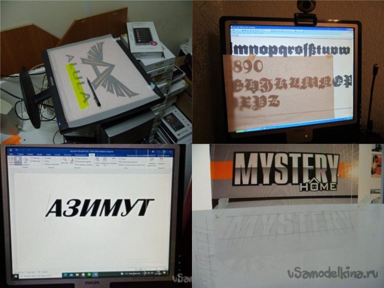 Для удобства работы просто вывожу текст на монитор в нужном масштабе. Закрепляю кальку кусочками малярного скотча, наклоняю его горизонтально и можно работать.