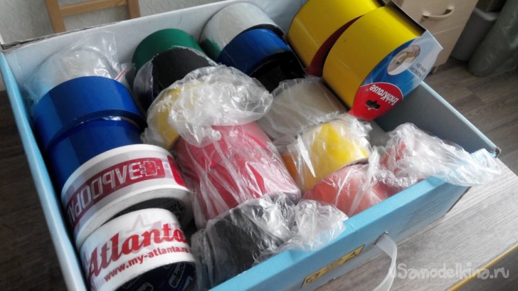 Цветной скотч. Храню в коробочке и в пакетиках, чтобы не налипала пыль на торцы рулончиков.