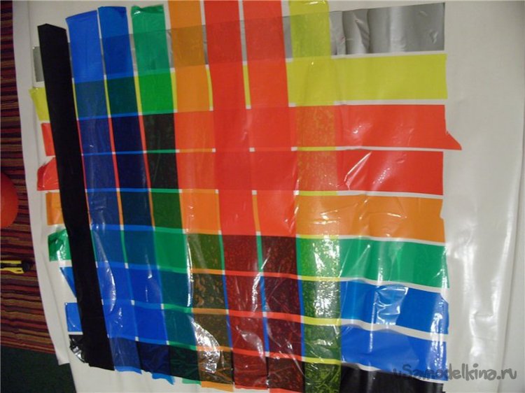Следующий прием, наношу цветные полоски. Скотч приклеиваю на подложку от пленки оракал. Бумага покрыта каким то пластиком. Которому плохо прилипает скотч. Таким образом, он легко отделается.