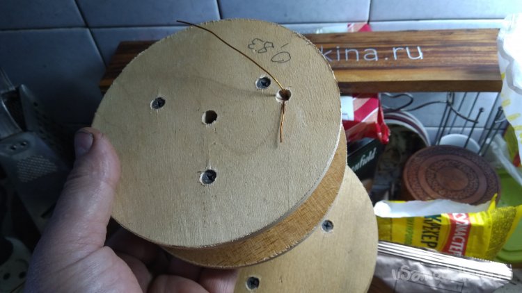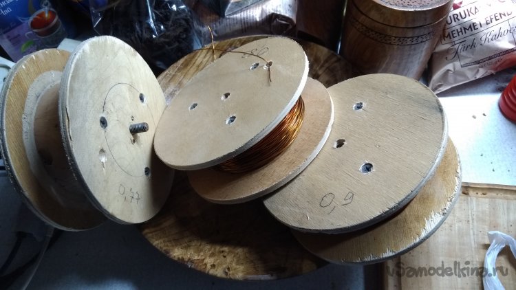 Для катушек использовал чурбачок, щёчки вырезал из фанеры балеринкой, стянул саморезами. Катушки получились лучше заводских карболитовых, на которые обычно провода наматывают.