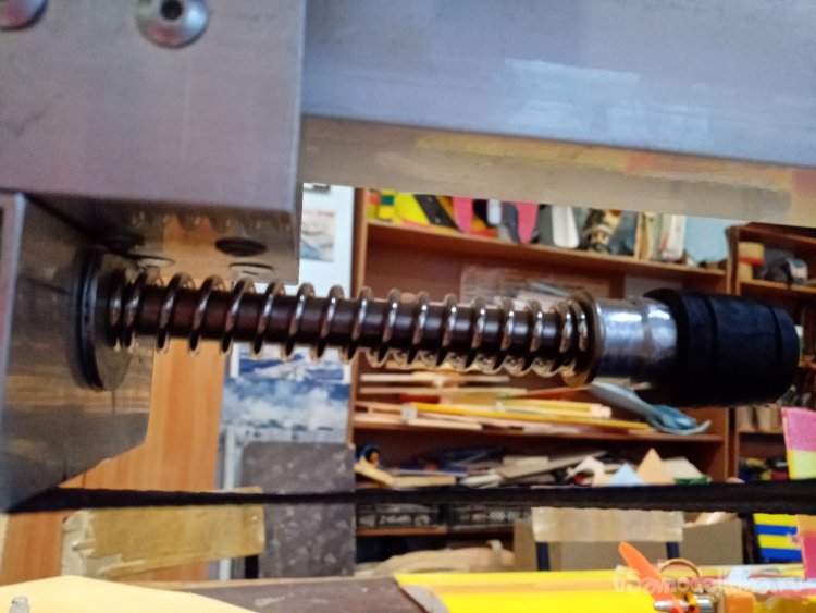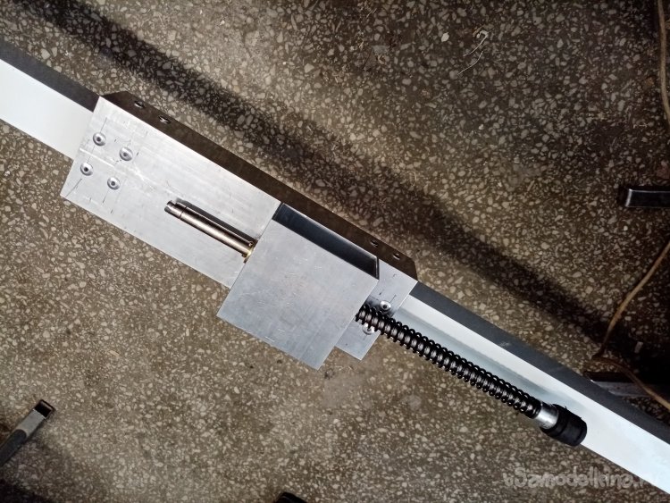 На нижнюю часть смонтировал шток с мощной пружиной остановки. Во время «холостых» испытаний пришлось несколько раз переделывать этот узел и подбирать пружины. Удар при остановке каретки получался очень сильный.