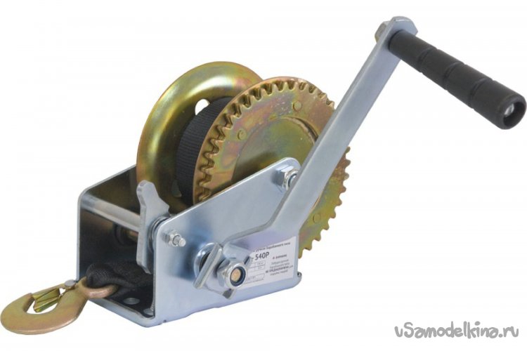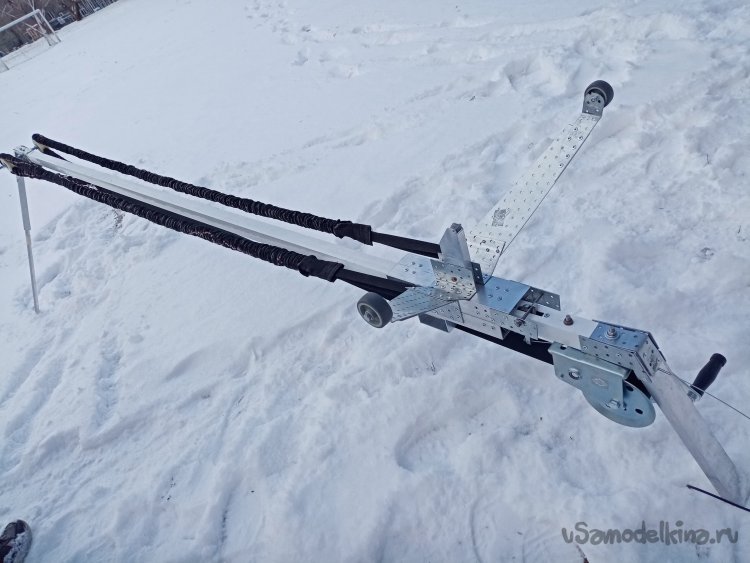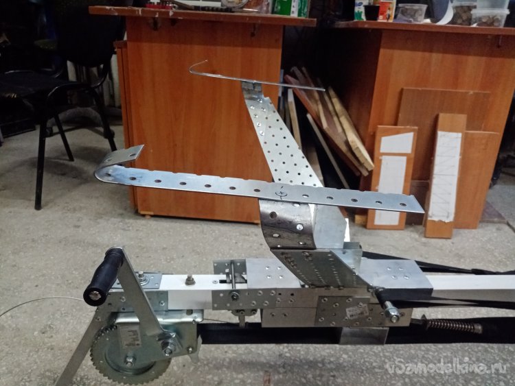 На одном конце штанги закреплена лебедка. Упор и защелка фиксации каретки. Защелка изготовлена по методу спуска арбалета.