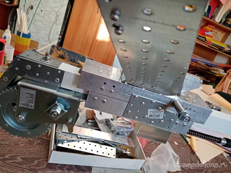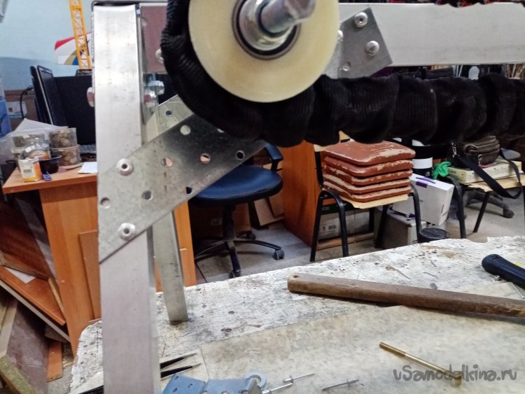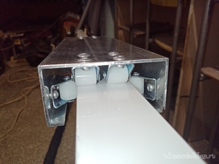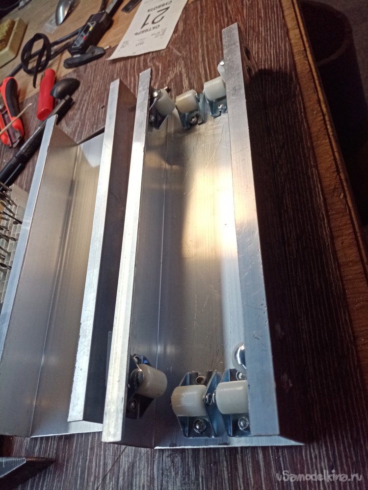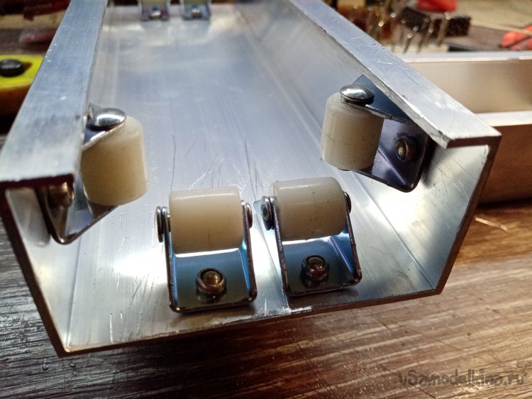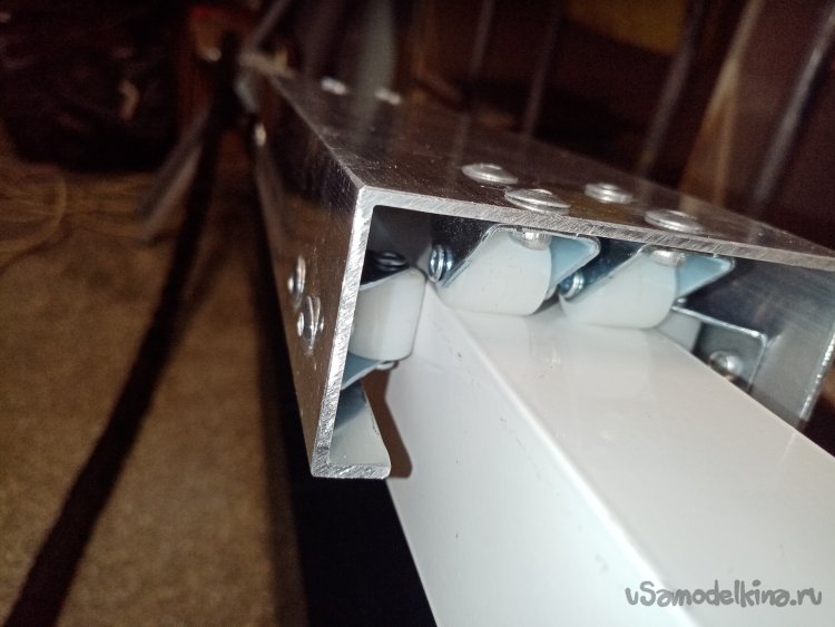 Разметив «люмень» начинаю бодро кроить болгаркой каретку. Режу кусочек, затем разрезаю по нужному размеру на два короба. Очень долго мерял и рассчитывал установку внутри половинок мебельных колесиков. Получилось по 8 штук в каждой половинке. Внутри деталей после разметки и сверления, приклепываю мебельные колесики. Получаются два короба с колесиками, нужно добиться практически полного отсутствия люфтов. Усилие на детали будут очень значительные. После изготовление всей «навески» на нижнюю и верхнюю часть склепаю их прямо на основной направляющей трубе, но потом. Они будут охватывать трубу. В моделке также нашлось немного пружин. Весьма жестких из этих штук буду городить амортизаторы остановки каретки.