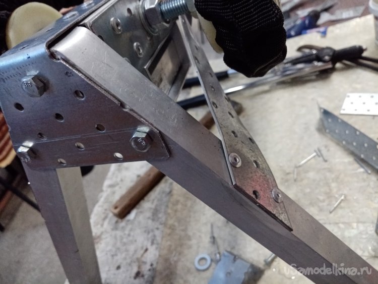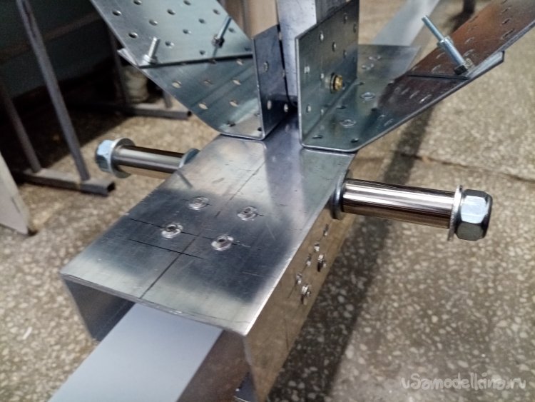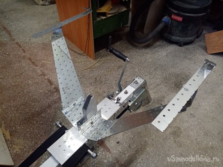На верхнюю часть смонтировал парочку толстых штырей круглой конструкции для закрепления оттяжек резинового шнура. И также крепление модели со складывающимся упором. В некоторых случаях нужно будет установить по бокам упоры с колесиками, для фиксации крыльев. Эта честь будет заменяемая. Собрал эту штуку из металлических оцинкованных пластин. Скрепив на вытяжные заклепки. Отверстия в пластинах как раз в 5мм. Резал детали болгаркой. Заусенцы снимал шлифовальным диском или мелкими напильниками. Много у нас моделей оказалось и все разные по креплению к катапульте к сожалению. Добиться единообразия не удалось. Можно будет достаточно легко снять и установить нужное крепление на каретку.