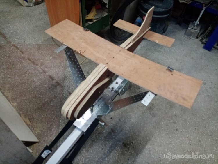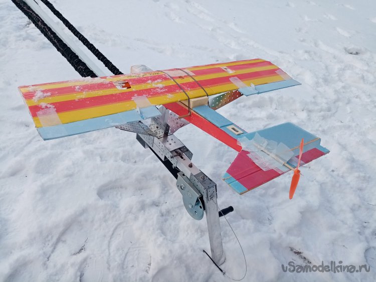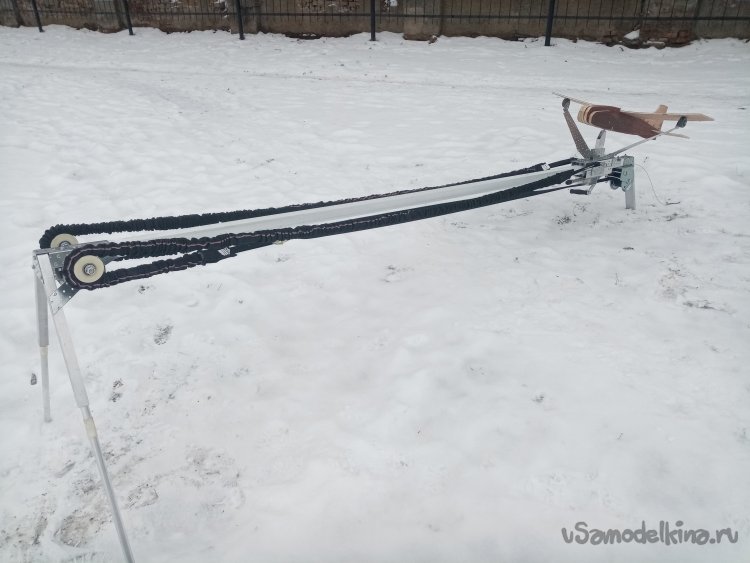 Разбили две деревяшки. Не могли нормально настроить рычаг закрепления модели. Вся сложность заключалась в том, что у многих моделей заднее расположение винта. При сходе с катапульты они могут зацепиться за шток. Основная идея состояла в том, чтобы при остановке каретки, шток за который цепляется крючок модели, складывался вперед очень быстро, освобождая пространство проходу винта. Не сходила нормально, цеплялась. На эту «мелочь» потратил две недели и четыре варианта крючка. Все получилось. Наконец забросили «полено» с крыльями на 25 метров. Затем решили попробовать закинуть пенопластовый самолетик.