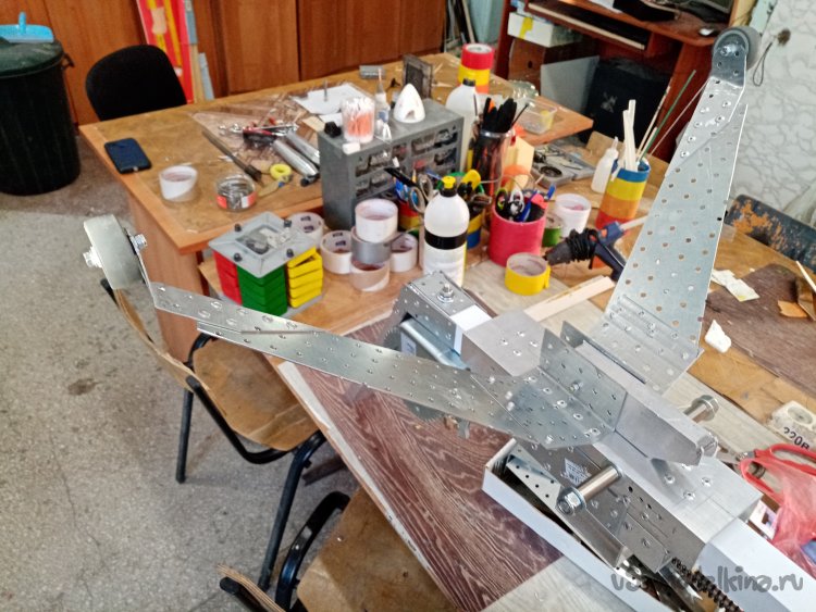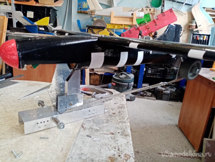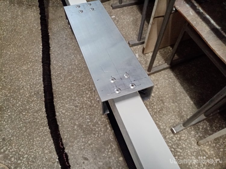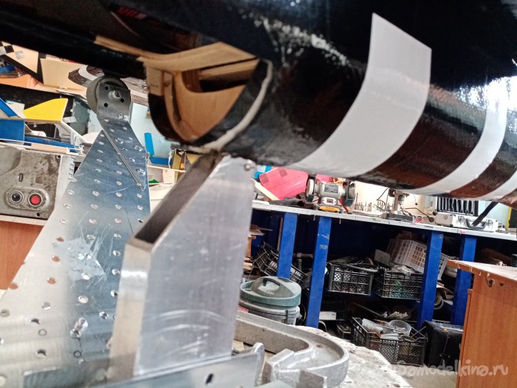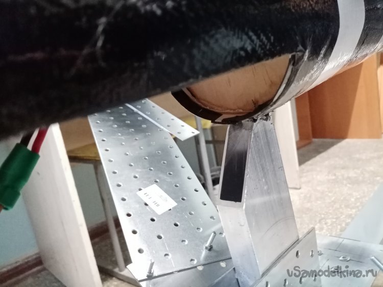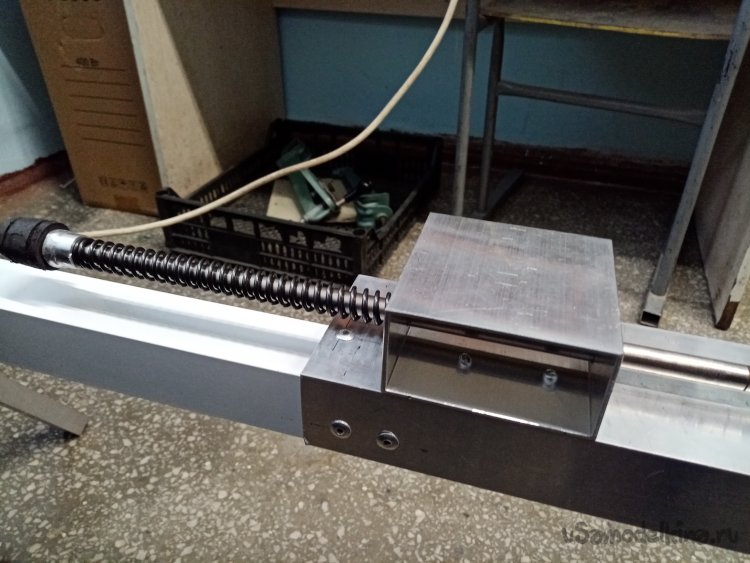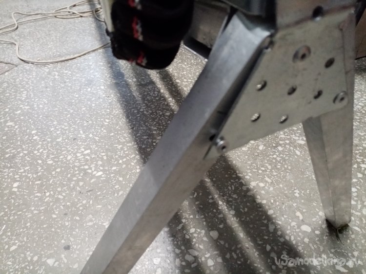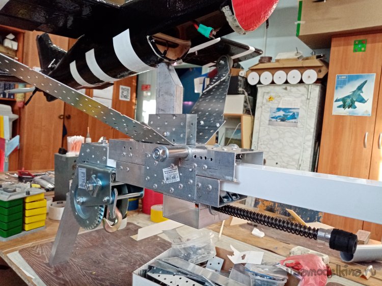 Также в носовой части приклепана солидная металлическая деталь остановки каретки. В нее врезается шток амортизатора с пружиной. Деталь тоже пришлось несколько раз переделывать. Достаточно толстый алюминий просто сгибало от нескольких ударов штока торможения с пружиной. Спасением послужил отрезок металлической квадратной трубы. Некоторое снижение звука удара добились при помощи наклейки на нее толстой резины в несколько слоев. Сначала слой очень жесткой резины (шайба хоккейная), затем парочка слоев более мягкой.