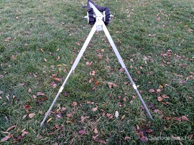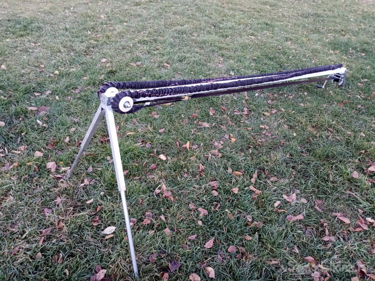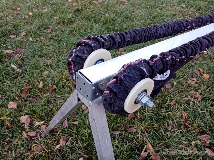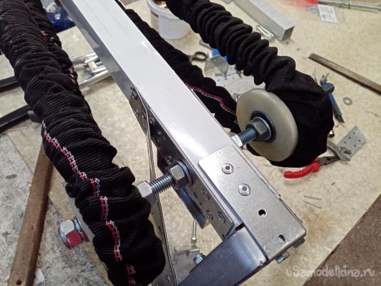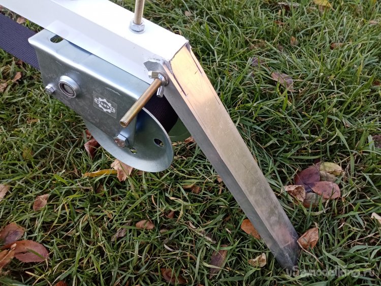 Противоположный конец принял на себя конструкцию ножек упора и парочку роликов под резиновые жгуты. В квадратные трубы вставляются дополнительные ножки, позволяющие регулировать угол установки всей конструкции.