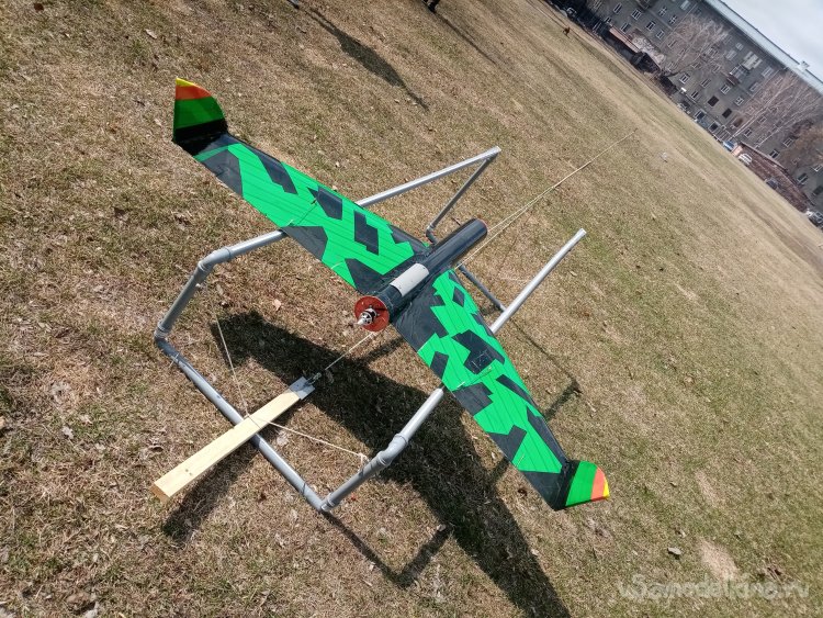 Некоторое время назад мы начали строить большие, тяжелые модели. Руками уже не забросишь на старте самолетик весом в 3-4 кило. Поэтому напрягаю мысль. Но если честно, все упирается в финансы. Первую катапульту собрали из остатков пластиковых труб. Из своих затрат, закуплены некоторые переходники, резиновая трубка для фитнеса и обычный хозяйственный шнур. На этой конструкции отработали старты моделей с передним и задним расположением винтомоторной группы. Больше всего возились с «заднеприводными» вариантами. Также изготовили и испытали несколько вариантов крепления резинового шнура и стартовой педали. Усилие на этой резине в 30 кг. Получив несколько раз по заду резинкой, придумали предохранитель от случайного срабатывания. Иногда наблюдали прогиб пластиковых направляющих, усилили при помощи деревянных реек вставленных в трубы.