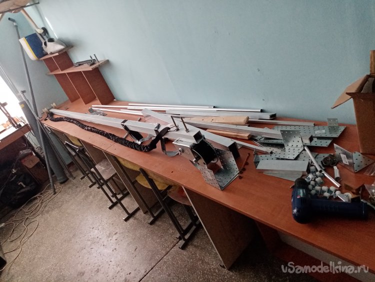 Все собралось в кучу, начинаю процесс. Пришлось докупить еще метр квадратной трубы 40х80 для изготовления разгонной каретки. Для обсуждение основных принципов конструкции провели несколько совместных обсуждений. Основным сдерживающим фактором конструкторскую мысль был весьма бедная комплектация. Пришлось корректировать наши планы наличием металла, крепежа и прочего ассортимента в магазинах.