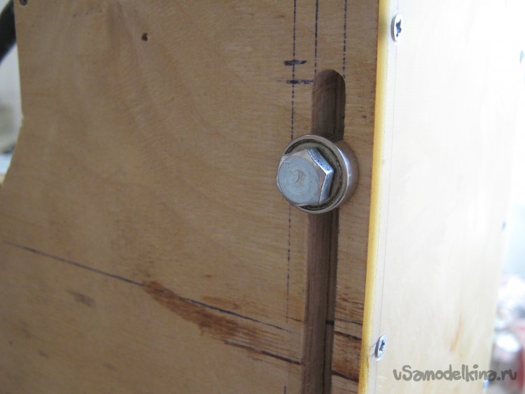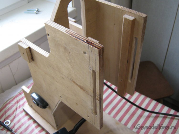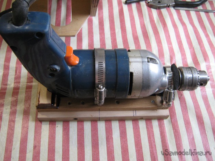 К основанию с помощью железных уголков (4 шт) 30х15х2мм крепятся вертикальные кронштейны (из фанеры 12мм, но можно толще) с направляющими для подвижной бабки. Направляющие сделаны из твердых пород дерева (обязательно!) , поскольку многочисленные возвратно-поступательные движения подвижной бабки вверх-вниз приводят к трению и дальнейшему люфту, что не есть хорошо.Впрочем, направляющие могут быть и из металлических уголков или профиля-главное абсолютная геометрическая форма. Подвижная бабка представляет из себя прямоугольную пластину из толстостенной фанеры (20мм) , можно стеклотекстолита, на которой с помощью червячнозажимных хомутов крепится добрая старая надежная советская дрель. Главное требование к этой детали, чтобы она была устойчива к изгибу при креплении дрели и абсолютная одинаковость ширины пластины по всей длине, иначе будет люфт.