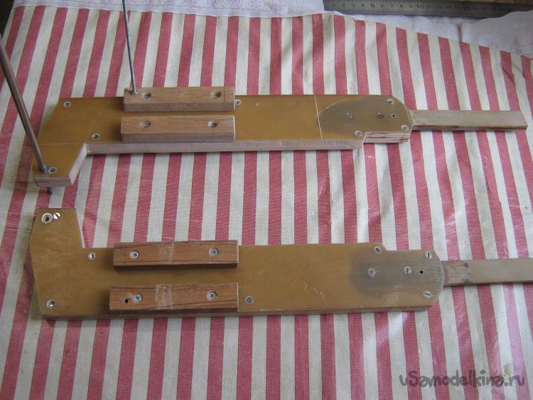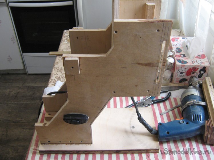 кронштейны не давая им "гулять" влево-вправо. В середине стойки-перемычки выпилено продолговатое отверстие для ручки дрели. На ручках рычагах сзади имеются удлинения, в дальнейшем там будет крепиться возвратная пружина приводящая подвижную бабку в верхнее положение после окончания сверления. Предусмотрена возможность установки плавного пуска или плавной регулировки оборотов, поскольку советская "гоночная машина" слишком резко стартует с места, но это как говорится приятные излишества. Свою функцию аппарат выполняет и без них.