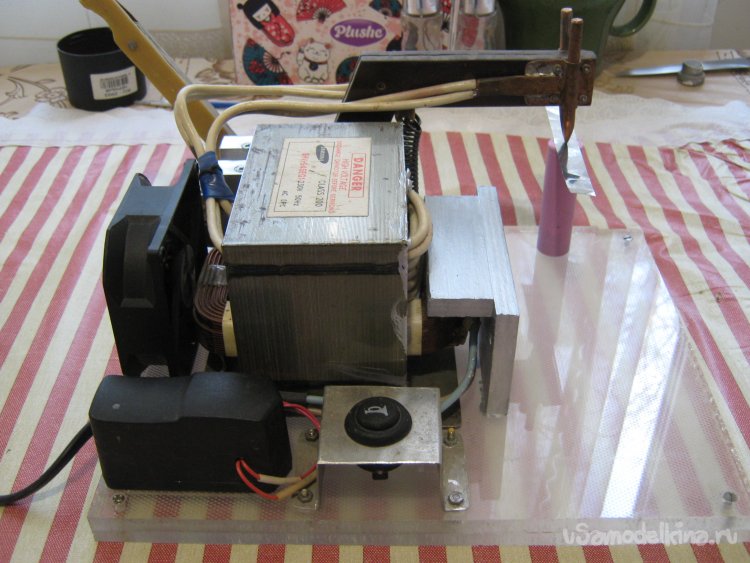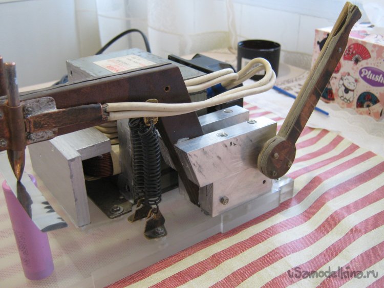 Предлагаю вниманию очередную версию сварочного аппарата контактной сварки. В части электрики ничего нового в нем абсолютно нет. Главной особенностью, пожалуй, можно назвать устройство контактной группы, держащей электроды. Многие, кто сталкивался с вопросами контактной сварки знает, что от величины прижима электродов к свариваемым деталям зависит электрическое сопротивление в точке контактов, а значит величина проходящего тока, а значит и качество сварки. Некоторые осуществляют прижим электродов двумя руками, нажимая ногой пусковую кнопку, кто-то старательно выравнивает контактные точки в горизонтальной плоскости. Но и первый и второй способы не дают гарантий от непроварки или наоборот от перепрожога. В данном решении это практически исключается за счет того, что электроды крепятся на независимых друг от друга изоляционных "гусаках", находящихся на одной оси, но имеющих каждый свою натяжную пружину. Причем величину прижима можно регулировать как жесткостью самих пружин, так и местом крепления последних к основанию. Чем ближе место крепления к основанию, тем пружина сильнее растягивается и тем больше прижим электрода. А так конструкция подобна тысячам других таких же выложенных в интернет. Основанием служит плита из оргстекла толщиной 16 мм. На ней расположен трансформатор от СВЧ печи "самсунг". Вторичная (высоковольтная)обмотка удалена, вместо нее намотаны 3 витка сдвоенным (что нашлось под рукой) медным проводом общим сечением 16 мм2. Изоляционные "гусаки" выпилены из гетинакса толщиной 6 мм. Пружины куплены в магазине автозапчастей по символической цене 18р за шт. Крючки на основании, к которым притягиваются "гусаки" лучше делать с несколькими отверстиями по высоте относительно поверхности основания. Это дает возможность регулировки усилия прижима. Ось на которой нежестко крепятся "гусаки" фиксируется в двух стойками. В моем случае выполненных из алюминиевого прямоугольного профиля 40х20х2. Здесь же находится ручка при надавливании на которую происходит подъем или опускание сварочных электродов. Электроды- жала паяльников диаметром 5мм. Обращаю внимание на то, что все контактные соединения во вторичной обмотке должны быть предельно надежными, так как токи большие и плохое соединение могут привести к нагреву и прогару контактов. Кроме того на основании установлен вентилятор обдува на случай длительных работ. Кнопка включения взята так же в магазине автозапчастей(может быть любой, но на ток не ниже 10 ампер). И самое главное: кнопку ставьте только в первичной цепи трансформатора, Иначе без большого БАБАХА не обойтись!