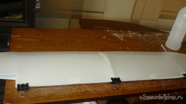 Склеиваю обшивку крыльев. Края потолочки фиксирую кусочками малярного, бумажного скотча и канцелярскими зажимами для бумаг.