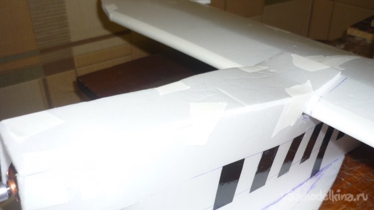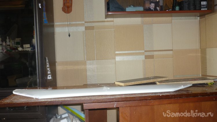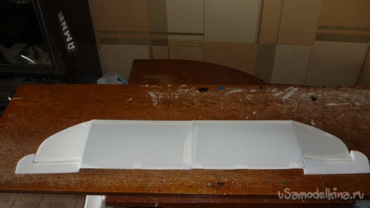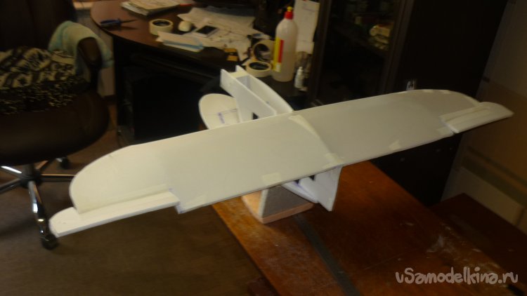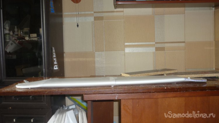 Но решил отказаться от этой затеи и не увеличивать V угол , и не утяжелять крыло деревянными рейками.