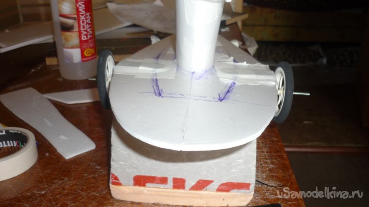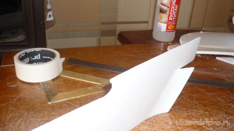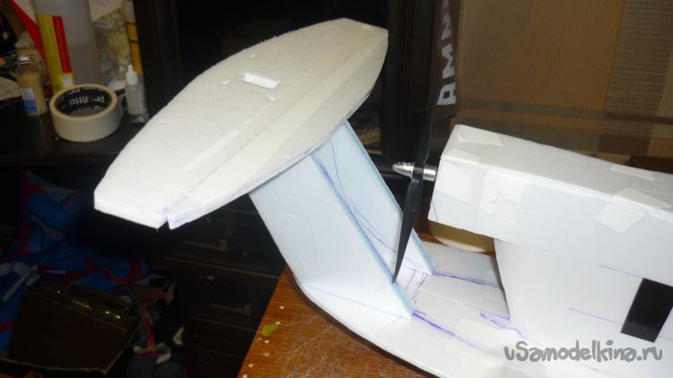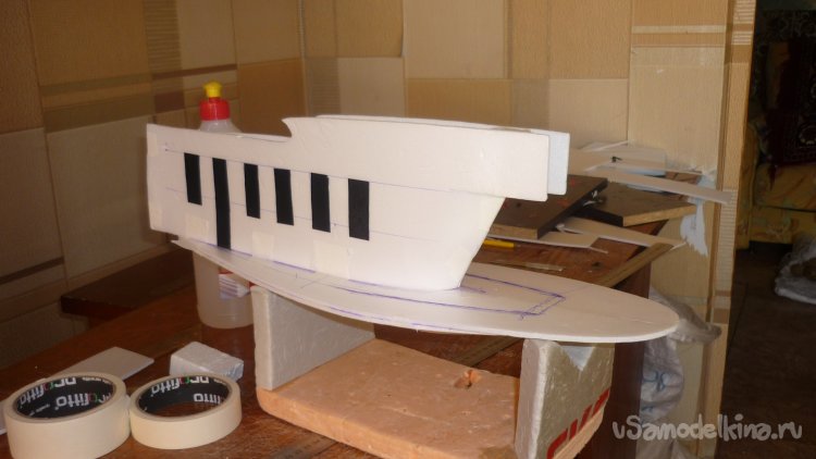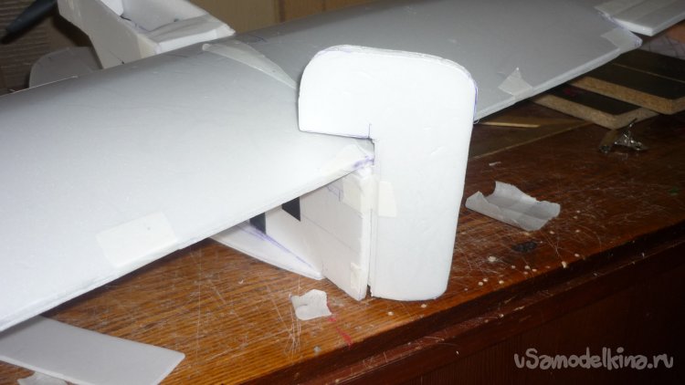 Вклеиваю пенопласт с фанерой между боковых стенок фюзеляжа в носовой части. Тут будет монтироваться мотор с винтом.
