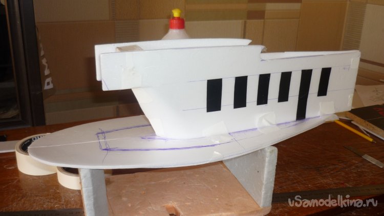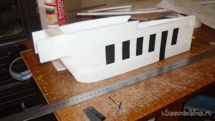 Обозначаю окна и двери на боковых стенках фюзеляжа, приклеив кусочки чёрного скотча.