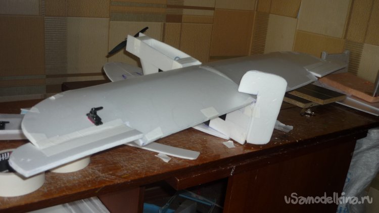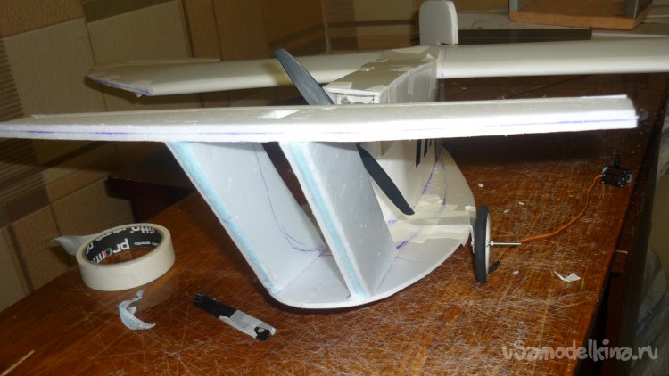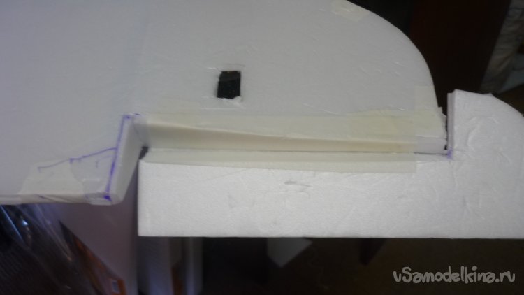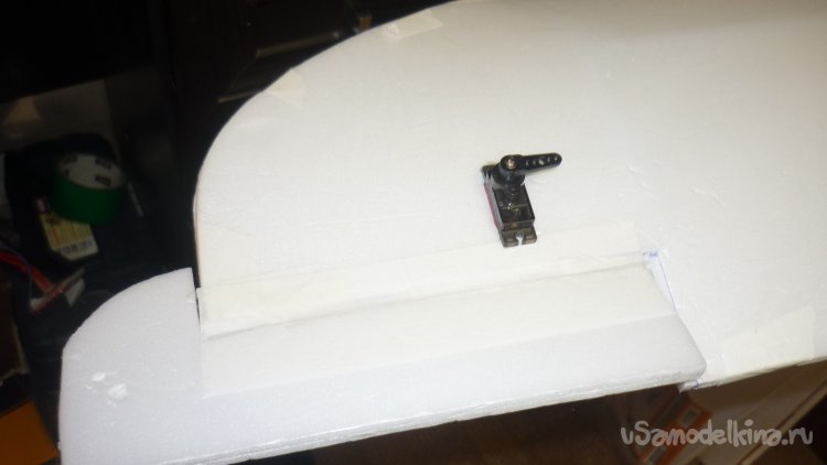 На бумажный, малярный скотч навесил руль высоты. Разметил место установки и смонтировал сервомашинку руля высоты.