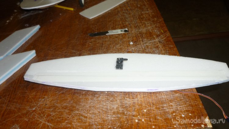 Монтирую сервомашинки, вклеиваю кабанчики, подсоединяю тяги для элеронов.