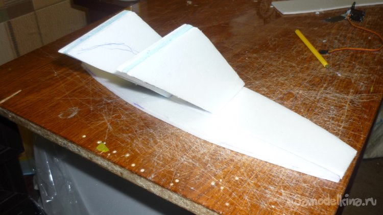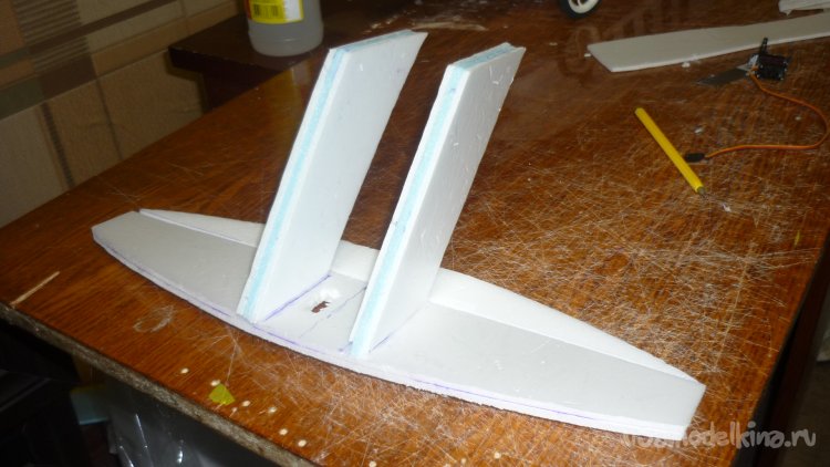 Вырезал заготовки и склеил в два слоя руль направления. Навесил на малярный, бумажный скотч.