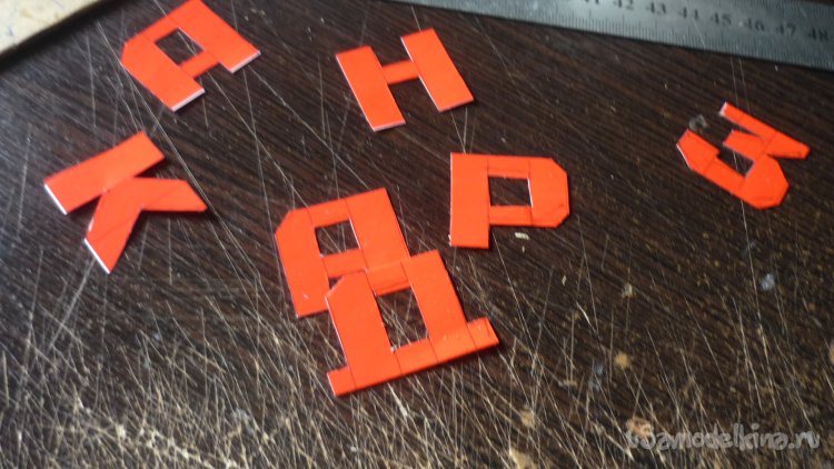 Разрезаю полоску по буквам, они очень чётко просматриваются через цветной скотч.