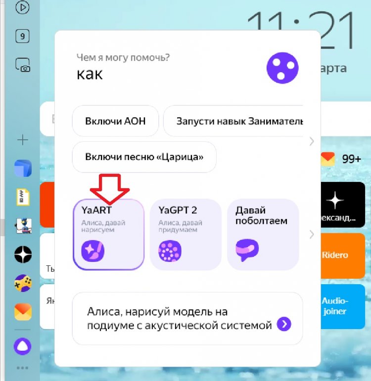 Желающие заказать рисунок от бота Алисы должны: 1). Установить на свой ПК, НБ или другое устройство приложение «Алиса». 2). Кликнуть по ярлыку – иконке, принадлежащему этому приложению. 3). Во всплывшем окне найти кнопку с текстом: «YaART Алиса, давай нарисуем». 4). В нижней строке с бледным текстом «Напиши мне» указать Алисе, что она должна вам нарисовать и нажать на значок ">".