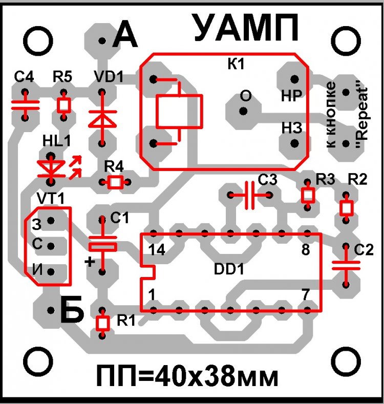 2). Питание (напряжение +5 Вольт) на УАМП лучше подавать не из точки А, а с анода диода 1N4007. Тогда свечение переливающегося индикатора будет подсказывать, что режим «Repeat» включён.