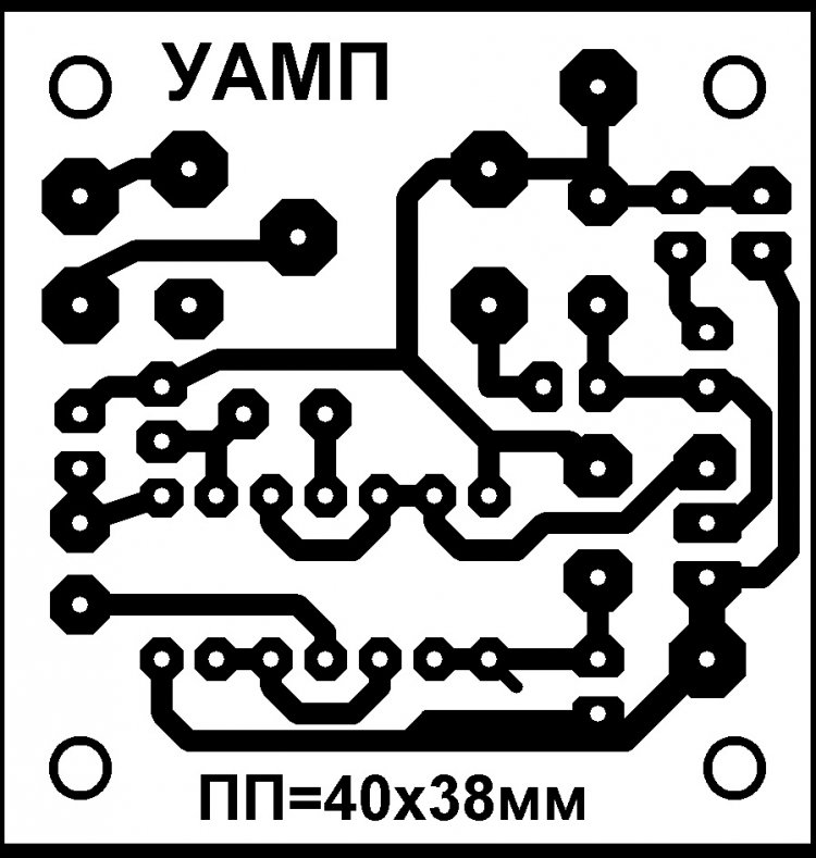Печатная плата УАМП выполнена из односторонне фольгированного стеклотекстолита размерами 40 х 38 х 1,5 мм (см. рисунки 3 и 4). Диаметр отверстий на плате под радиоэлектронные компоненты – 0,7 … 0,9 мм, под соединительные проводники - 1…1,2 мм., под крепёжные винты – 2,5 … 2,6 мм.