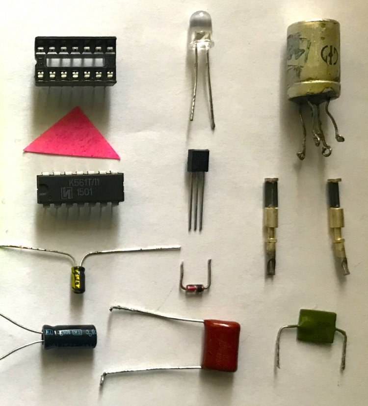 Основные детали, использованные для изготовления УАМП. Оба ряда выводов ИМС DD1 К561ТЛ1 перед установкой в сокет изгибаются под углом 90 градусов. Элементы DD1 и VT1 КП505А требуют защиты от статического электричества.