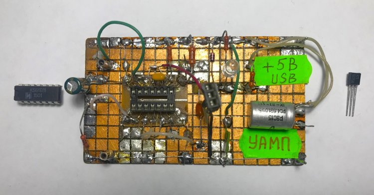 Внешний вид спаянной макетной платы УАМП. Остаётся только установить на плату полевые структуры. Транзистор VT1 КП505А (для защиты от статического электричества), также устанавливается в самодельную трёхвыводную розетку, сделанную из сокета типоразмера DIP14.