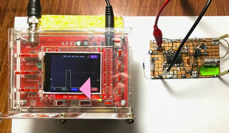 С помощью осциллографа на выводе 10 элемента DD1.3 измерена и уточнена длительность (200 мс) выходного импульса ОВ, составленного из элементов DD1.3, DD1.4 и времязадающей цепи C3 R3.