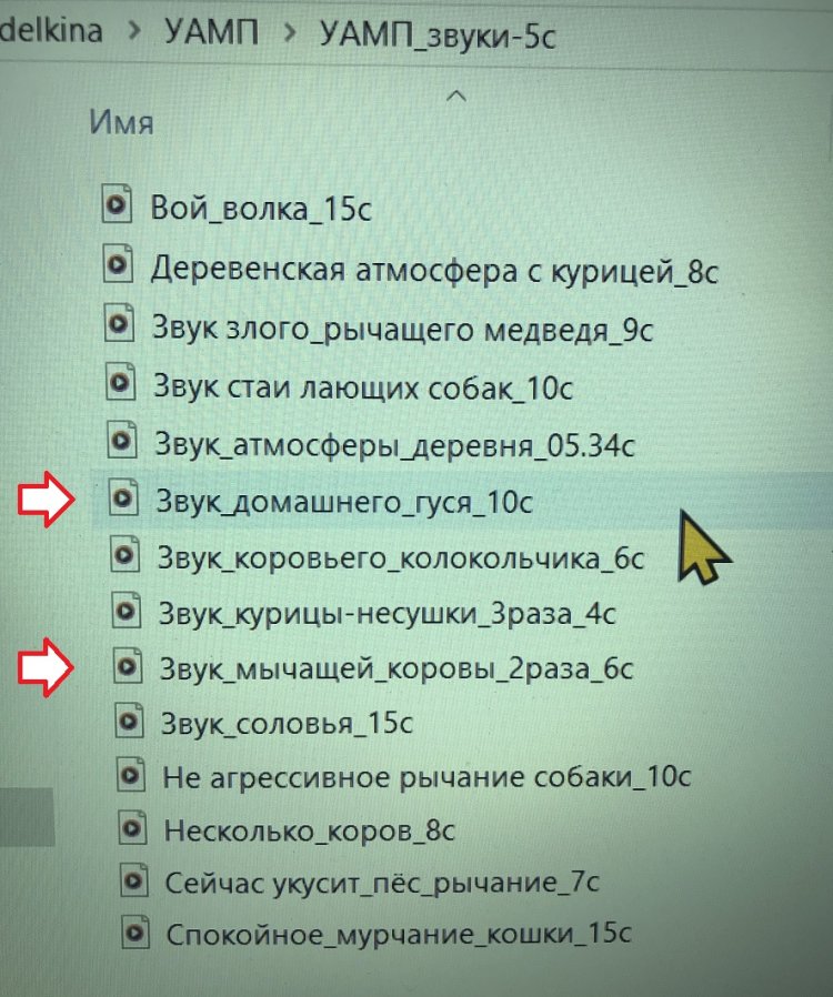 Репертуар звуковых файлов, предварительно записанный на НБ в папку «УАМП_звуки-5с» состоит из 14 треков с расширением .mp3. Для быстрой проверки работоспособности УАМП длительность треков выбрана минимальной (от 4 до 10 … 15 секунд). Красно – белыми стрелками на рисунке 12 указаны треки, которые на видео последовательно воспроизводятся плеером (при отключённом УАМП). При включённом УАМП многократно воспроизводится только один трек – кудахтанье курицы.