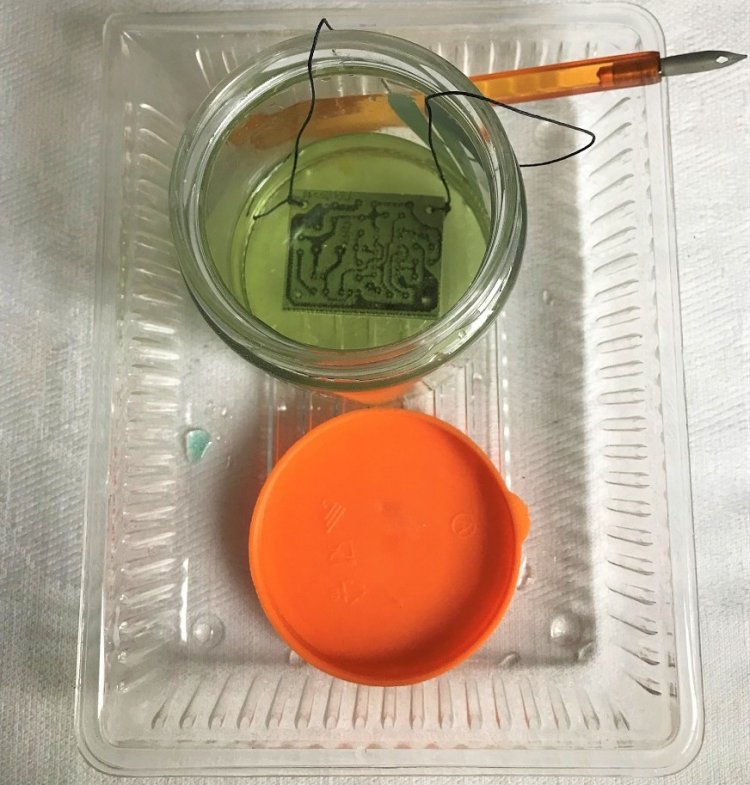 Визуальным признаком процесса травления платы являются мелкие газовые пузырьки, поднимающиеся с поверхности медной фольги печатной платы. Время травления при комнатной температуре может составлять от 20 минут до нескольких часов (зависит в основном от сроков хранения применённых химических компонентов). Для ускорения травления в раствор рекомендуется добавить 1-3 чайные ложки NaCl (поваренной соли), употребляемой в пищу. Можно также увеличить температуру травящего раствора в водной бане до 70 … 90 ºС. В случае «закипания» раствора, кюветку с травящим раствором можно переместить в ванночку (тазик) с холодной водой для прекращения кипения.