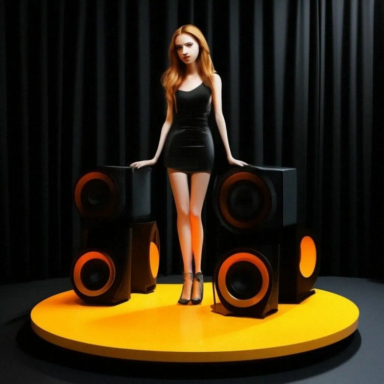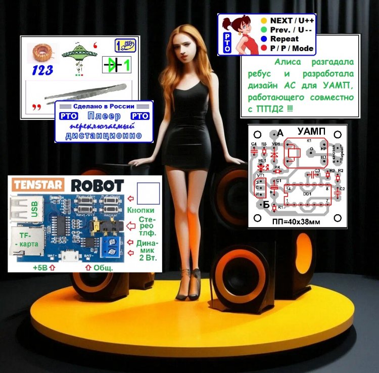 Бот Алиса, узнав, что 2-ваттный УЗЧ ППД2 работает на маломощный динамик, разработала для статьи УАМП дизайн АС (акустических систем). В центре рисунка – это то, как Алиса «видит» себя на подиуме при демонстрации АС.