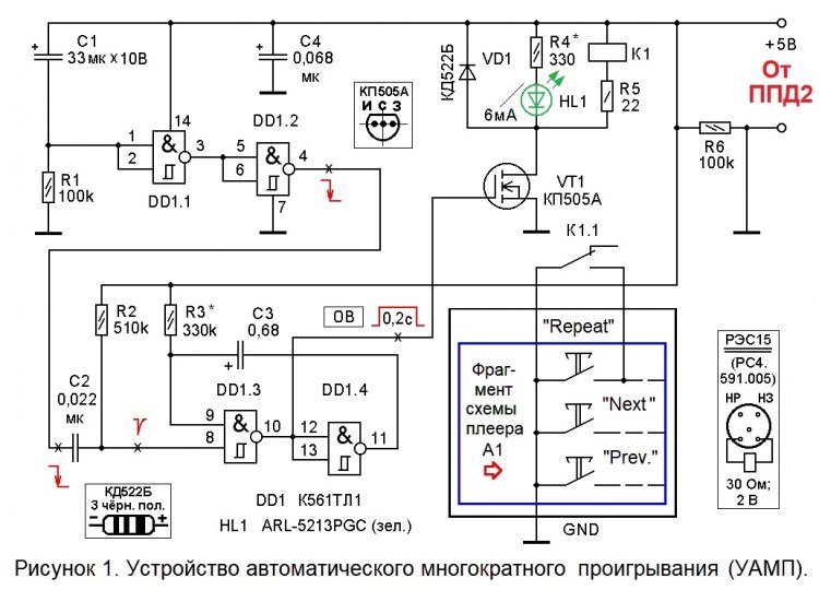 С выхода ОВ (вывода 10) элемента DD1.3 импульс положительной полярности поступает на затвор полевого транзистора VT1. Транзистор VT1 открывается (сопротивление канала исток – сток уменьшается до нескольких десятых долей Ома) и комплексная стоковая нагрузка HL1 R4 К1 R5 работает в течение 0,2 секунды. Зелёный светодиод HL1 ярко вспыхивает, а контакты реле К1.1 замыкают контакты кнопки «Repeat» плеера А1. Режим работы плеера «All» (воспроизведение всех треков по порядку), который был включён по умолчанию (при включении питания +5 Вольт), сменяется режимом «One» (бесконечное - до выключения питания - воспроизведение только одного трека).