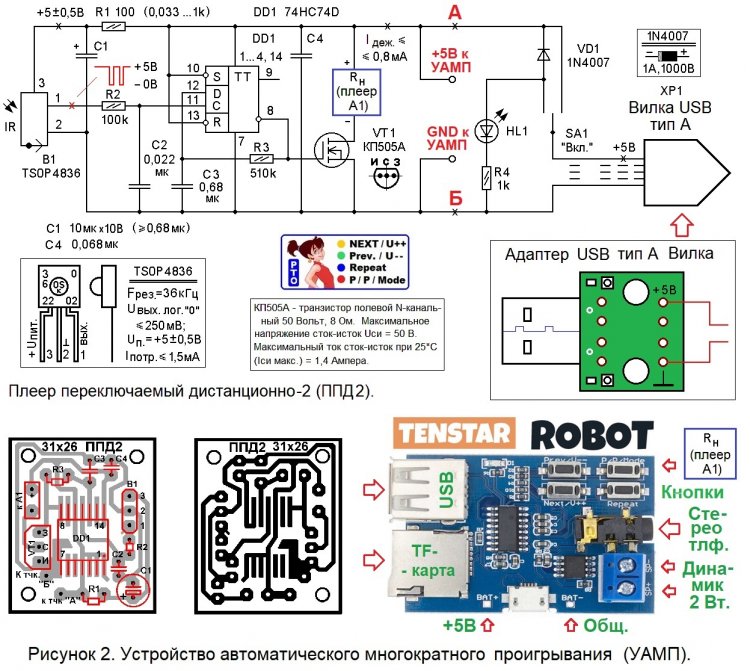 Статья УАМП является руководством по модернизации ППД2 (Плеера, переключаемого дистанционно - 2) - см. рисунок 2 или для других разновидностей плееров, не имеющих принудительной («по умолчанию») установки режима «Repeat» при включении питания.