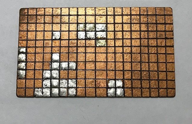 Фольгированная сторона платы разрезана на квадратики размером 5х5 мм. и покрыта жидкой канифолью.