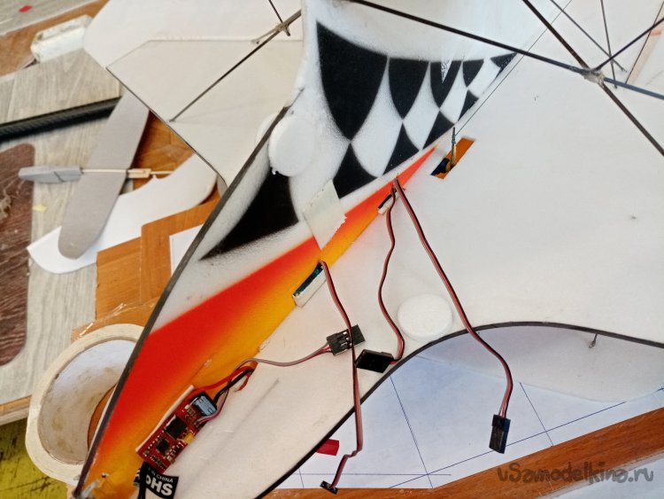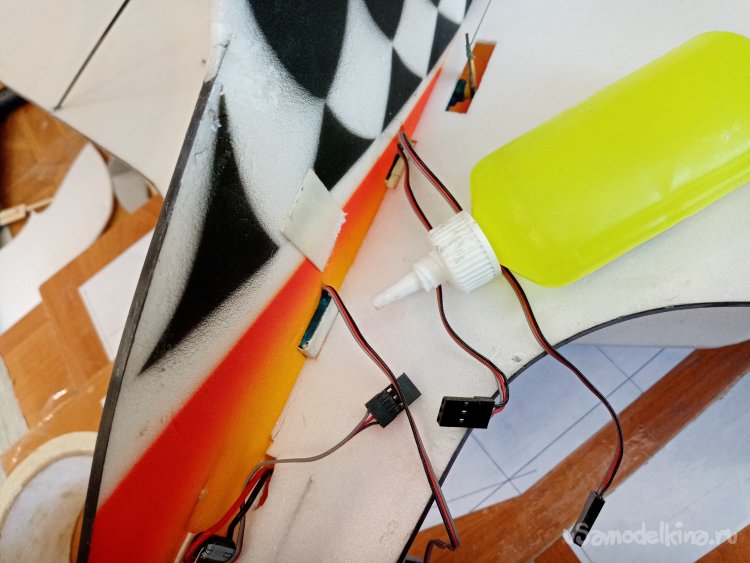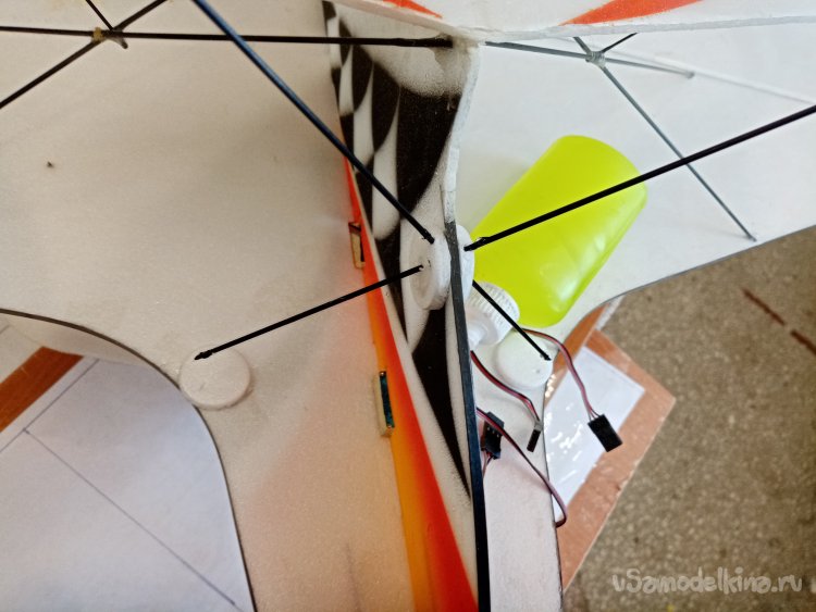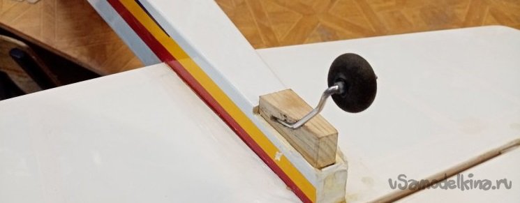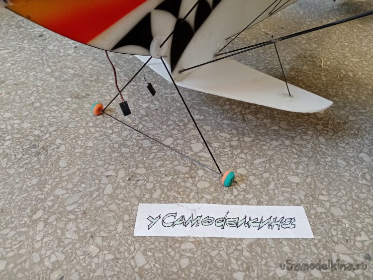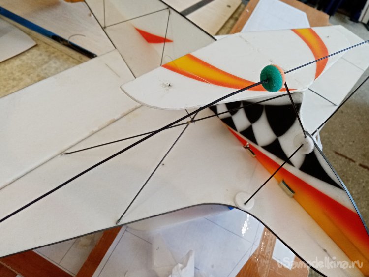 Просто аккуратно протыкаю пенопласт под нужным углом. Таким образом, примеряю местоположение стоек шасси.