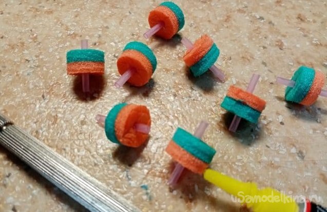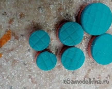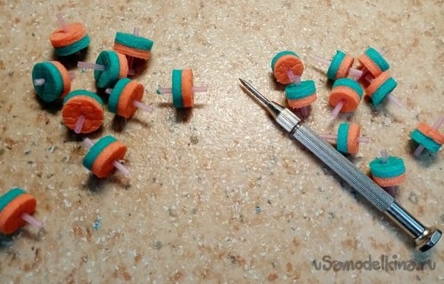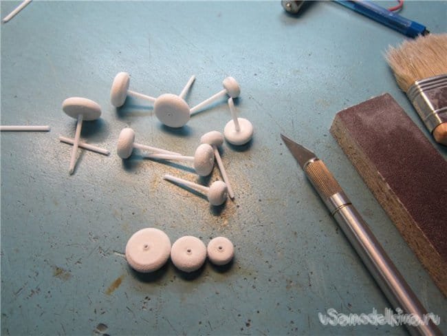 Технология изготовления такой модели колесиков у меня отработана достаточно хорошо. Иногда делал из пористого материала от упаковок планшетов. Хорошие белые колесики получались.