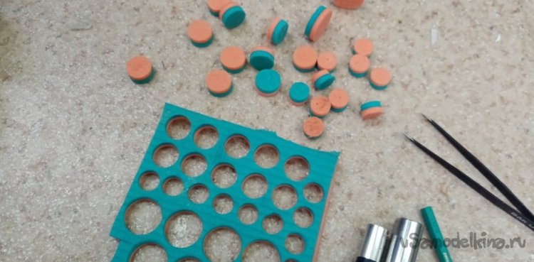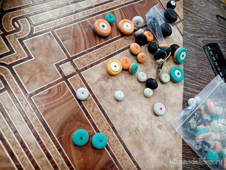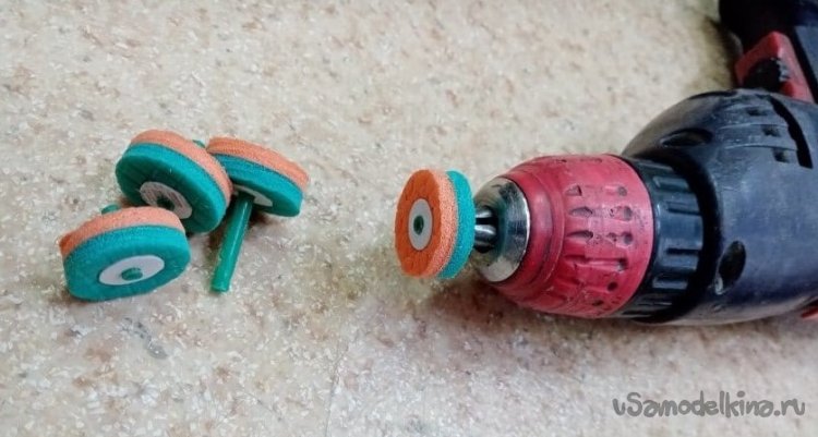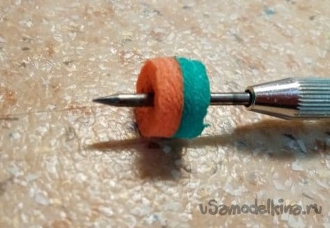 Это самое место готовлю при помощи шила. Прокалываю по центру колесика отверстие. Вклеиваю трубочку на циакрин. Он хорошо проникает в пористые материалы. Создает вокруг трубочки еще одну небольшую зону прочного материала пропитанного клеем. И так готово. Имею некоторое количество колесиков различного диаметра, готовых к отработке.