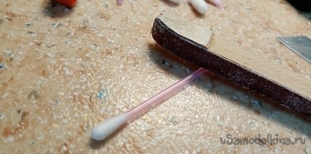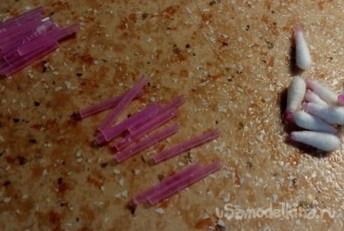 В качестве трубочки в колесики буду вставлять пластик от ушных палочек. Внутренний диаметр как раз под прутик стойки будет. Для лучшей адгезии шкурю кончик. Слегка лохмачу фасонным утюжком с крупной шкуркой.