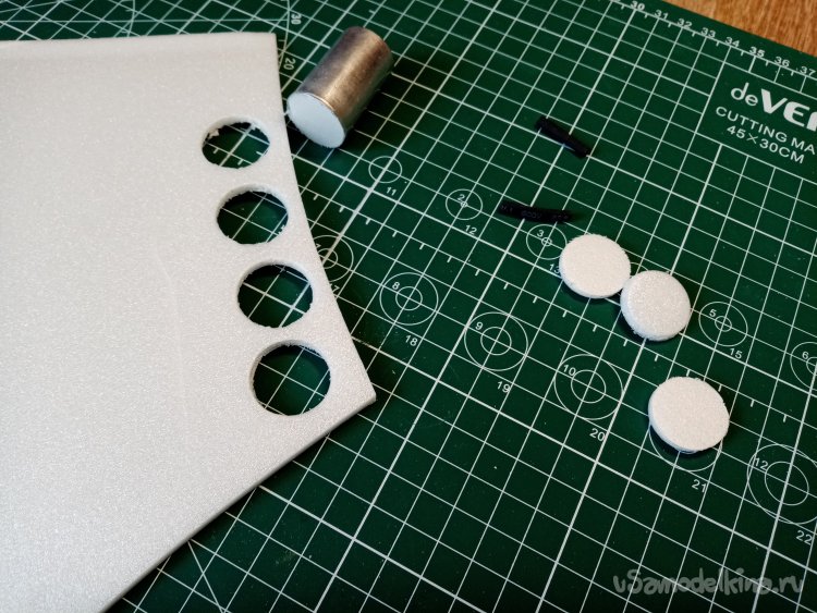 Для начала нужно изготовить пенопластовые накладки усиления на фюзеляж и крыло самолетика. Поскольку стойки шасси будут крепиться непосредственно в потолочку. А она достаточно тонкая, примерно в 3.5 мм. Накладки изготовил в виде пенопластовых кружочков. Просто и красиво. В запасе нашелся кусочке потолочной плитки, больше собственно и не нужно. Кружочки буду выпиливать трубочками. Изготовленными достаточно давно, именно для этой цели. Резать пенопласт различной толщины. Особой прочности инструмента в этой операции не требуется, он изготовлен из разного материала. Изначально были применены алюминиевые корпуса от конденсаторов. Отрезаю одну сторону, затачиваю край надфилем, затем лезвием канцелярского ножа делаю зазубрины по краю. Прорезание отверстия осуществляется вращением трубочки. Как бы пропиливаю. Затем, по мере необходимости изготовил другие варианты, трубочки от антенн, баллончики от пены для бритья и так далее. Извлекаю коробочку с трубочками. Подбираю подходящий размер. Оказался корпус от конденсатора. Напиливаю четыре пенопластовых кружочка усиления.
