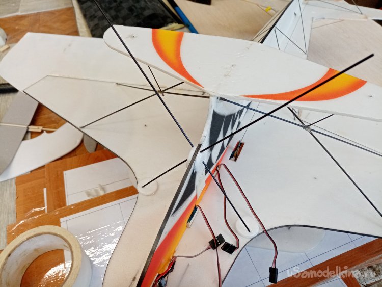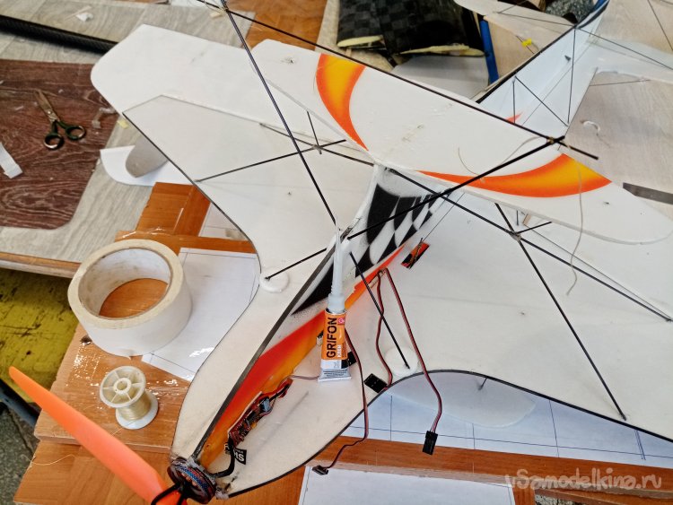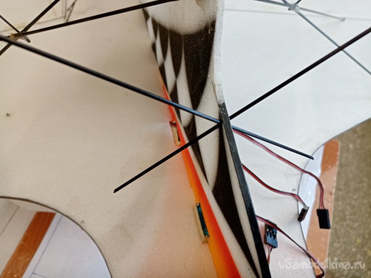 Протыкаю карбоновыми прутиками все усиления и располагаю стойка шасси под нужным углом. Затем извлекаю немного из пенопласта. Наношу на кончики титан и вставляю обратно в отверстия.